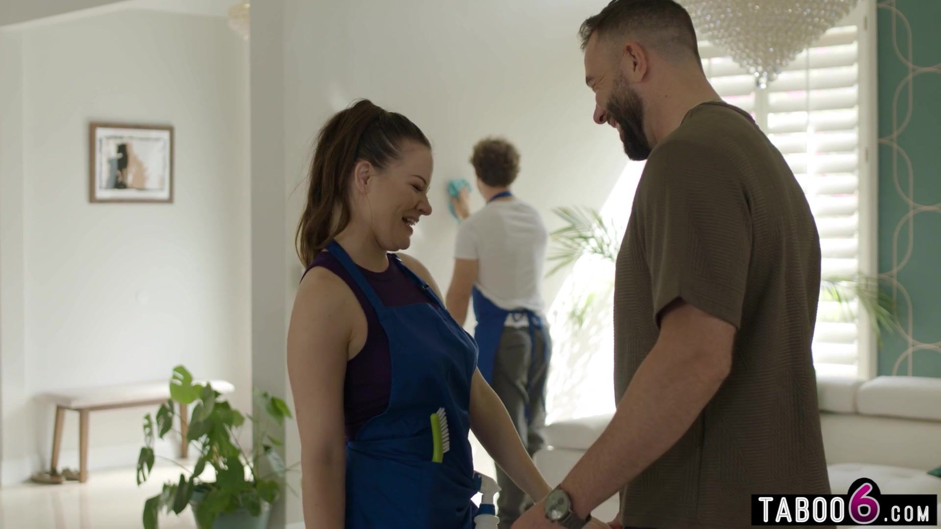 Married latina maid Alison Rey cheats with wealthy homeowner with her husband right there They could not afford to lose another client in the housecleaning business they run together! So he just kept cleaning while they were fucking!