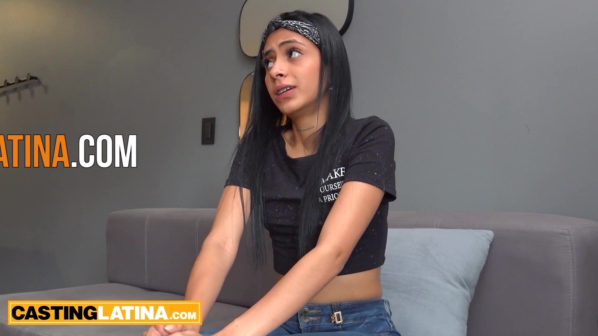 Petite amateur latina slut Cloe Violeta with tiny boobs cant focus on the interview and keeps staring on the producers big dick She doesnt need much motivation to fuck She takes on a sexy pink lingerie then she grabs the huge cock